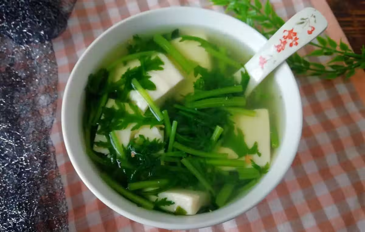 小貼士:內酯豆腐比較嫩,不要弄碎了,茼蒿切成寸段,茼蒿的梗部和葉部分開放,煮湯時,先下入茼蒿梗煮,再下入茼蒿葉煮,這樣茼蒿葉不會煮過火,梗和葉熟制時間一致。茼蒿很容易熟,煮制顏色變深綠就可以,時間不用過長。
