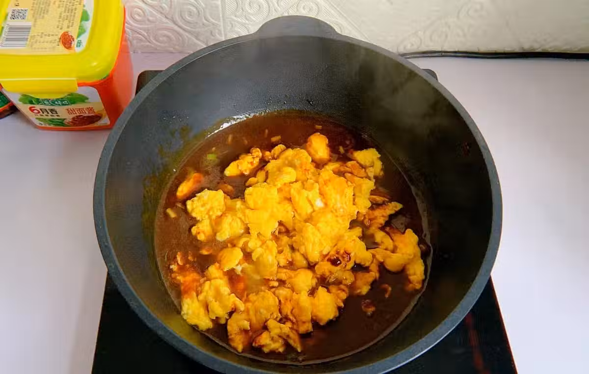 7.倒入炒好的雞蛋,翻炒均勻,使雞蛋都裹上醬汁。