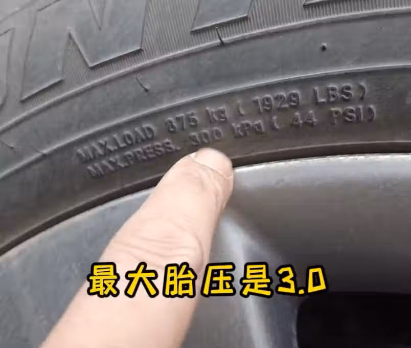 以上是汽車廠家給的標準胎壓,那麼,輪胎極限胎壓該怎麼看,這裡就可以直接在輪胎上查看,比如視頻中的輪胎,直接標註最大胎壓3.0,那麼,該車如果超過3.0的胎壓,就會有爆胎風險。
