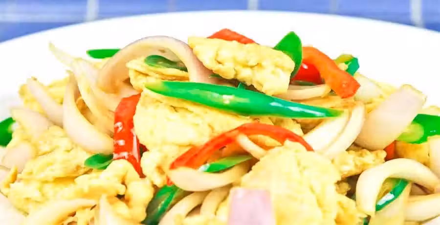 2.洋蔥半個切成小片,紅椒半個切成片,一起放入裝杏仁的碗中。