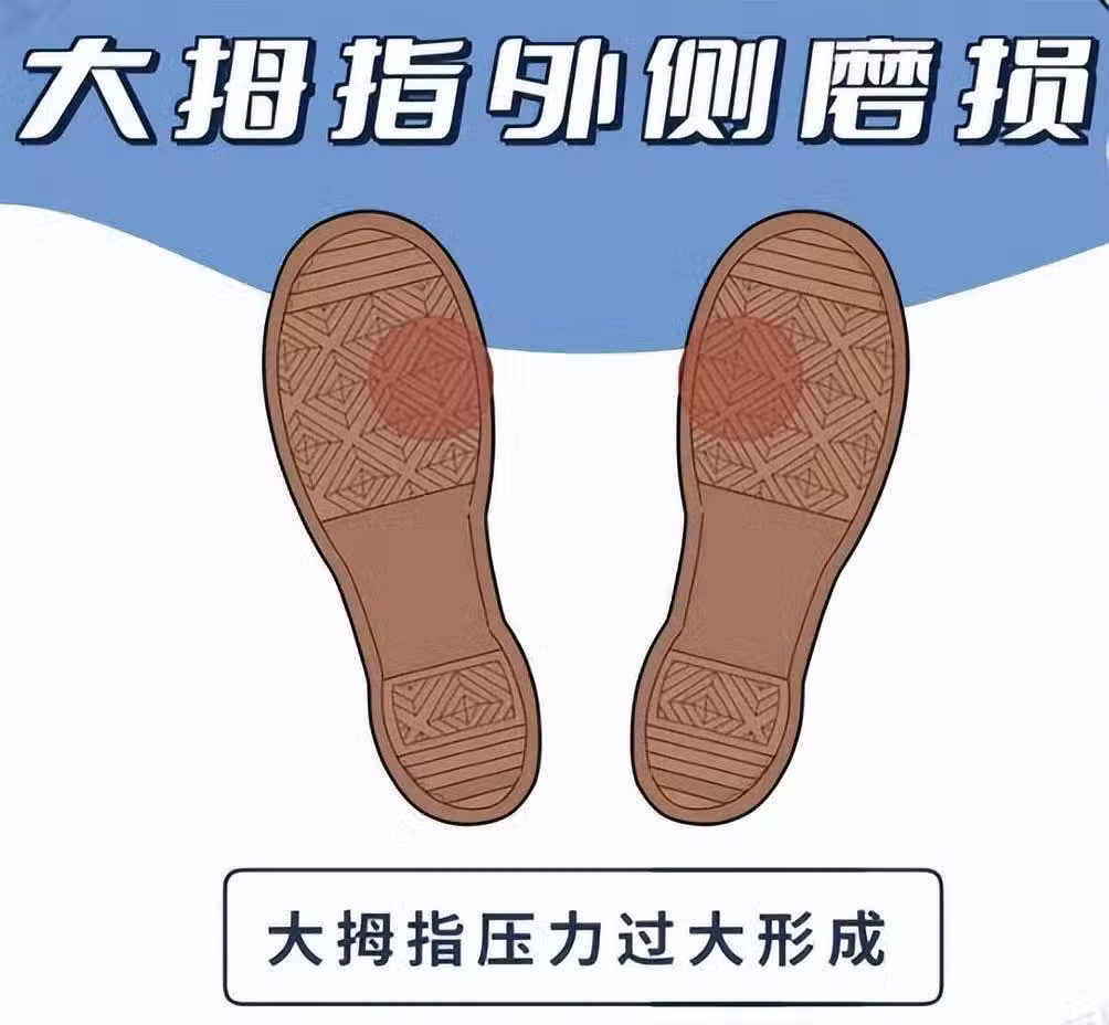 如果鞋底後跟和前掌的外側磨損嚴重,這種受力方式往往與扁平足相反,一般常見於高弓足。高弓足容易導致關節扭傷和損傷,嚴重時還會引發關節炎,導致坐立時骨骼的長久疼痛,形成X型腿。