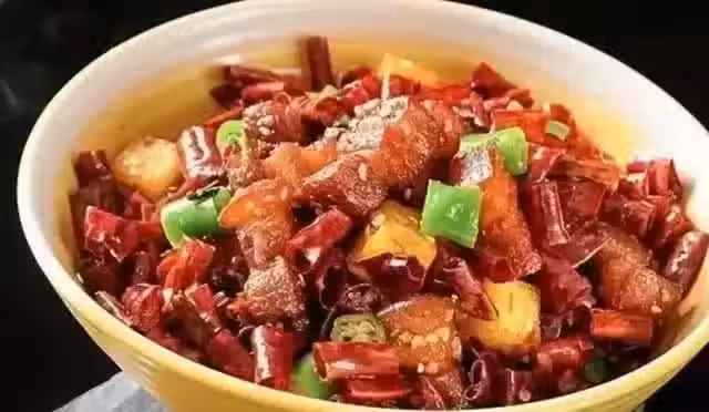 2.鍋留底油,投入干辣椒節、乾花椒和洋蔥一起炒香後,放入炸過的紅燒肉和青紅椒圈,邊炒邊調入鹽、味精和雞精,起鍋盛入裝有土豆條的盤裡,最後撒上蔥花即成。