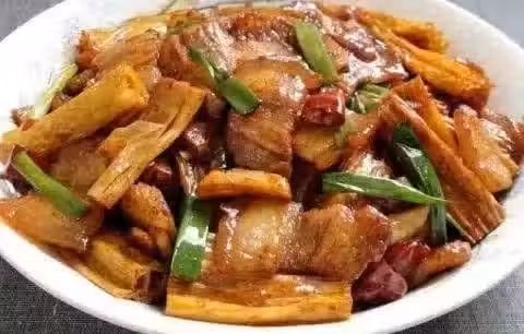 材料:五花肉300克、腐竹150克、姜4片、蔥4棵、蒜4瓣、干辣椒4個、生抽兩勺、老抽半勺、豆瓣醬1勺、鹽1克、雞粉2克