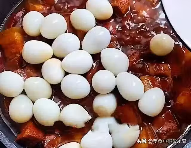 第五步,五花肉燉30分鐘後,打開鍋蓋下入提前剝好的鵪鶉蛋,蓋上鍋蓋繼續燉10分鐘左右。