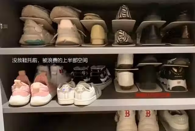 沒有用雙層鞋拖之前,鞋櫃每一層可以放4雙鞋, 而現在有了這個雙層鞋拖了以後,由4雙鞋就變成了8雙, 擴容了一倍,對於鞋子多,無處放小夥伴非常有幫助。