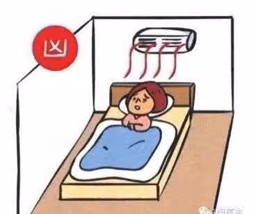 床位安置在空調下方,寒氣不斷吹向頭、肩、頸,加上人在睡眠狀態時,毛細孔會略微放開,輕者經常感冒,重者會造成頭、肩、頸的神經緊張、肌肉僵化。