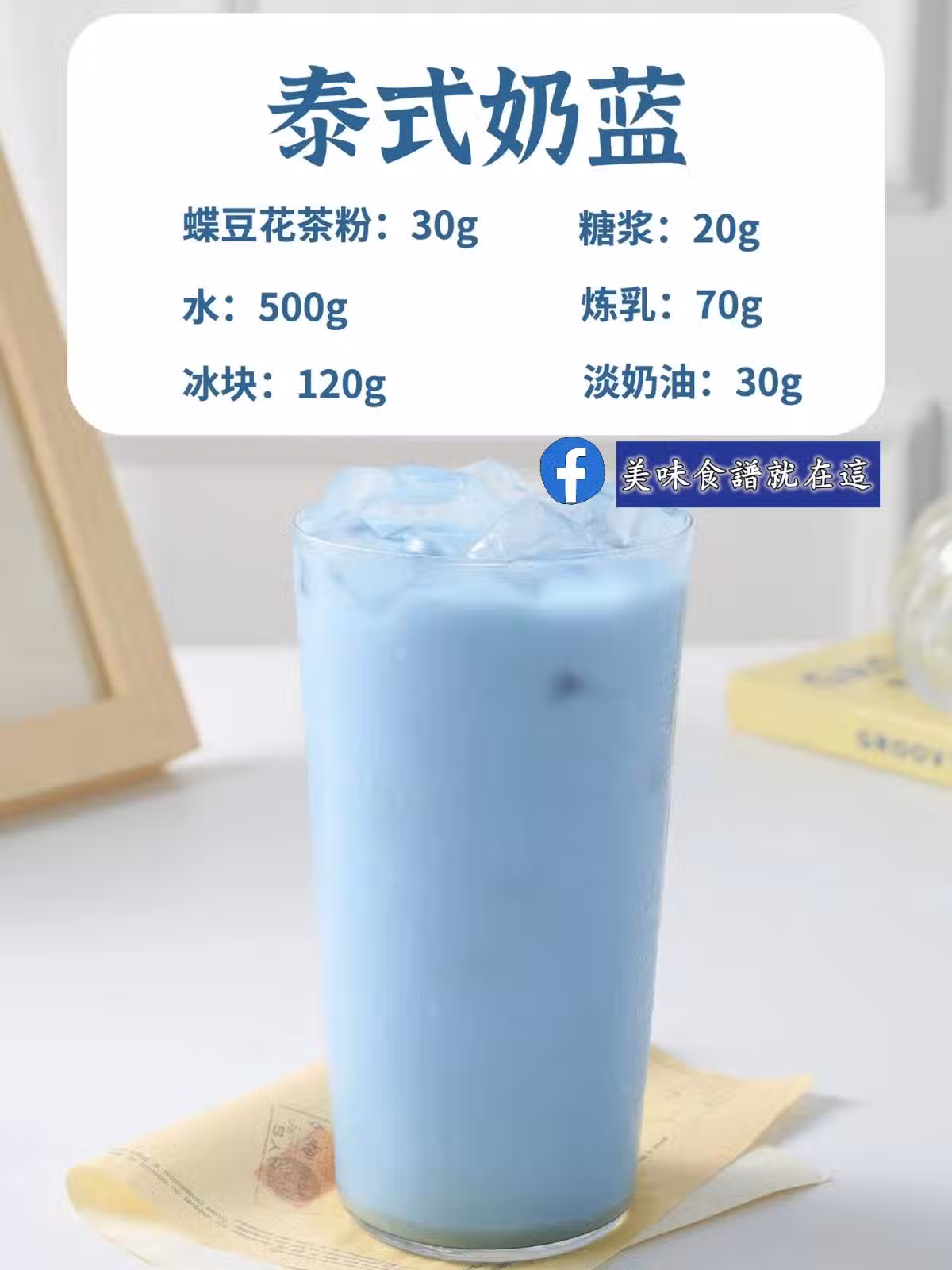3️⃣杯子裝滿杯冰塊,倒蝶豆花茶,補淡奶。