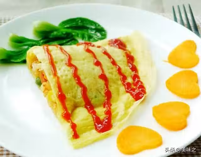 9、再將蛋皮對摺,封口處按壓粘牢,出鍋後淋上少許番茄醬即可。