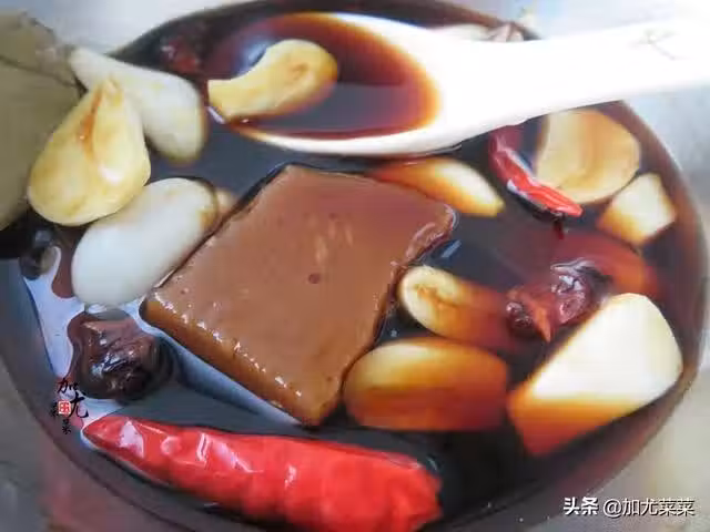 2、黃姜去皮切成片,取3片香葉,半顆八角和2個小米椒洗乾淨,香蔥沖洗乾淨切成蔥花備用。小盆中加入3勺醬油,半勺老抽,1勺料酒,一小塊紅糖,4勺溫水和香葉,薑片,八角攪拌在一起備用。