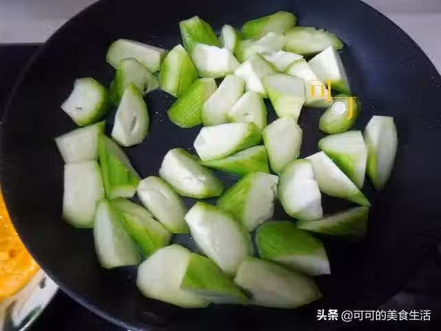 原鍋再略加少許油,加入絲瓜翻炒,略加半小碗水,加一小勺鹽