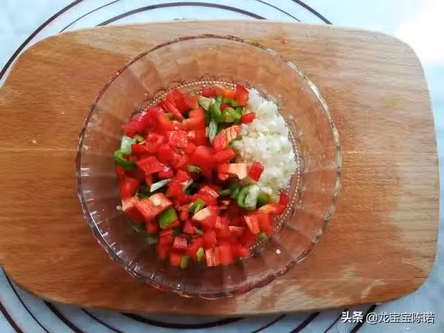 2.青椒切成小顆粒,紅菜椒也切成同樣大小,蒜米去皮切碎,盡量的切碎一些。