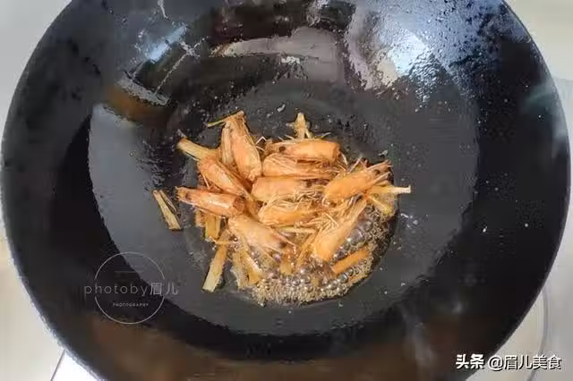 5、放入腌制過的蝦仁,煸炒一會至蝦仁變色。