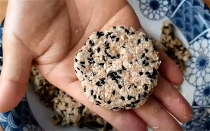 3.再取一塊麵糰在手心來回的捏一下,然後搓圓按扁,這樣一個燕麥餅的胚子就出來了。