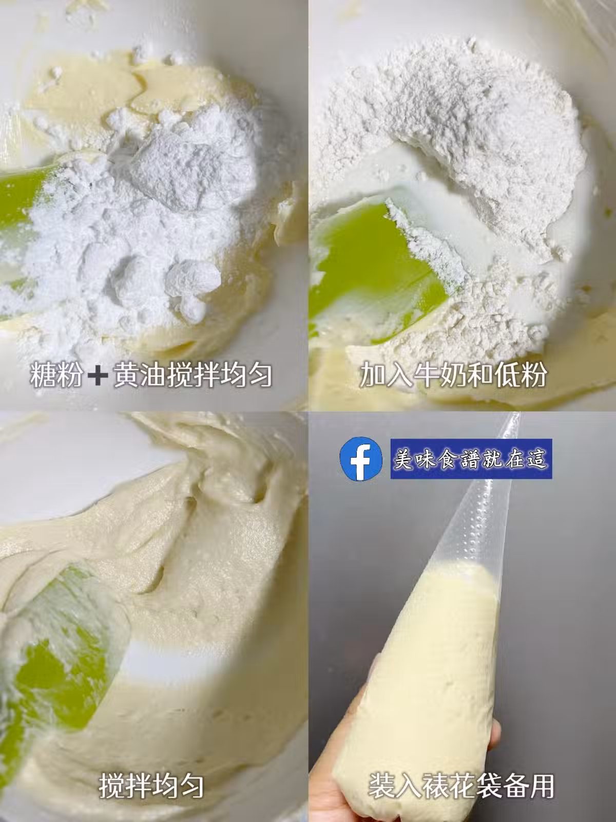 (黃油➕低粉攪拌均勻,然後加入牛奶和低粉攪拌均勻,最後裝入裱花袋備用~)