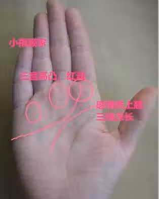 2.掌厚背圓,手厚肉實,掌色紅潤,手軟如棉,運勢根基見好,有福之人。手上三線深長明晰,福祿壽三宮紅潤高凸,事業線明晰直上,表示你小有職權,事業不錯。感情線末端走向食指下方,完美上翹,表示你情心堅定,尊重丈夫,婚姻和諧,富貴有福,一生有人疼愛,一生不愁,一世風光,謂之好命格