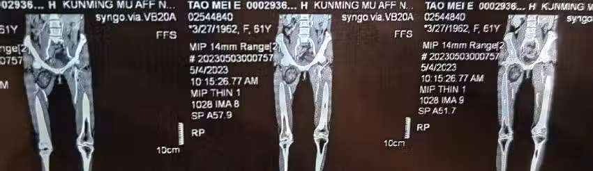 經過彩超、下肢血管、平掃+增強+三維CT檢查,並未發現血管堵塞,血流是通暢的,在右大腿內收肌群有佔位,提示考慮惡性腫瘤可能。
