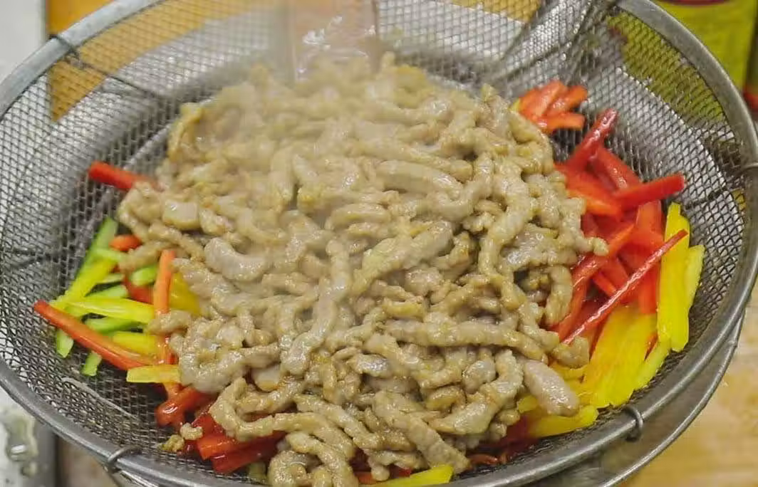 3、上過漿的牛肉絲想要保持滑嫩感,滑油是最關鍵的一步。鍋里燒寬油,油溫升至四成熱時,把肉絲倒進去快速攪散,讓它均勻受熱。前後20秒的時間,肉絲定型變白起鍋。