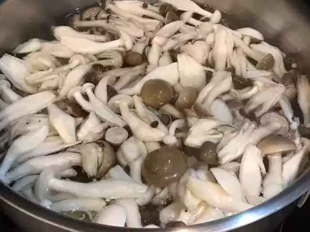 Step1.鴻禧菇和雪白菇,放入加了1小匙鹽的滾水中川燙,3-4分鐘後撈起,沖洗一下開水後瀝干水份。