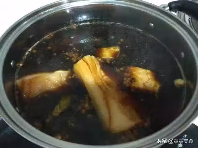 洗白白的豬肘子就可以煮了。鍋里放入老鹵湯(上次煮後的鹵湯過濾渣子,凍冰箱就是老鹵湯)加水燒開,再放些鹵料:白芷,白寇,草寇,桂皮,香葉,花椒,大料,丁香,每種都加一點。如果是白水煮,就分量加倍。煮五分鐘放入肘子和五花肉。水要沒過肘子。加老抽調色,喜歡顏色重就多加些。也可以放糖色,不過最近黃黃炒糖色少了,醬油的顏色就挺好。