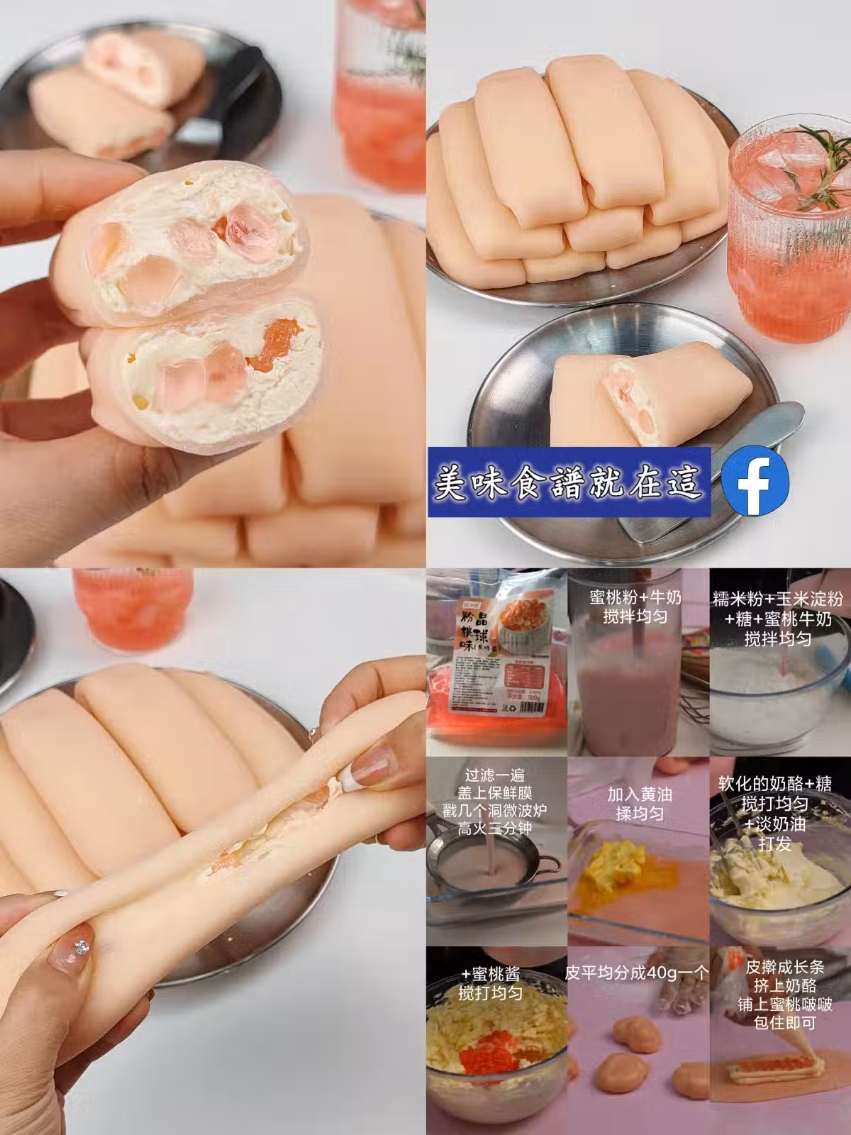 4⃣️ 皮擀成長條,擠上奶酪,鋪上蜜桃脆波波包住即可