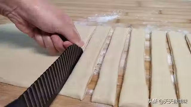七、再從中間對半切開,這樣一個油條的生胚就做好了。