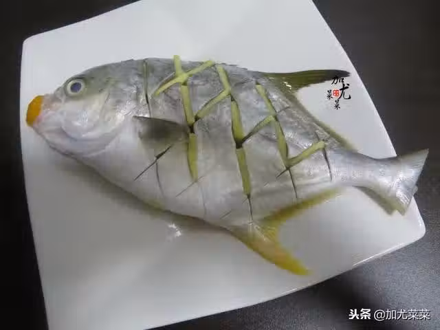 2、黃姜洗乾淨,切成絲,蔥條洗凈切成蔥絲,小米椒也切成細條狀。倒少許料酒和食鹽抹下魚身的兩面,魚肉縫裡夾入薑絲,再切幾塊金桔堵上魚嘴和魚肚。