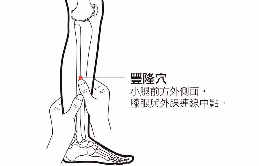 找到豐隆穴,順時針按摩5分鐘,逆時針按摩5分鐘,然後順著豐隆穴垂直向下的方向來回的搓,搓10分鐘。