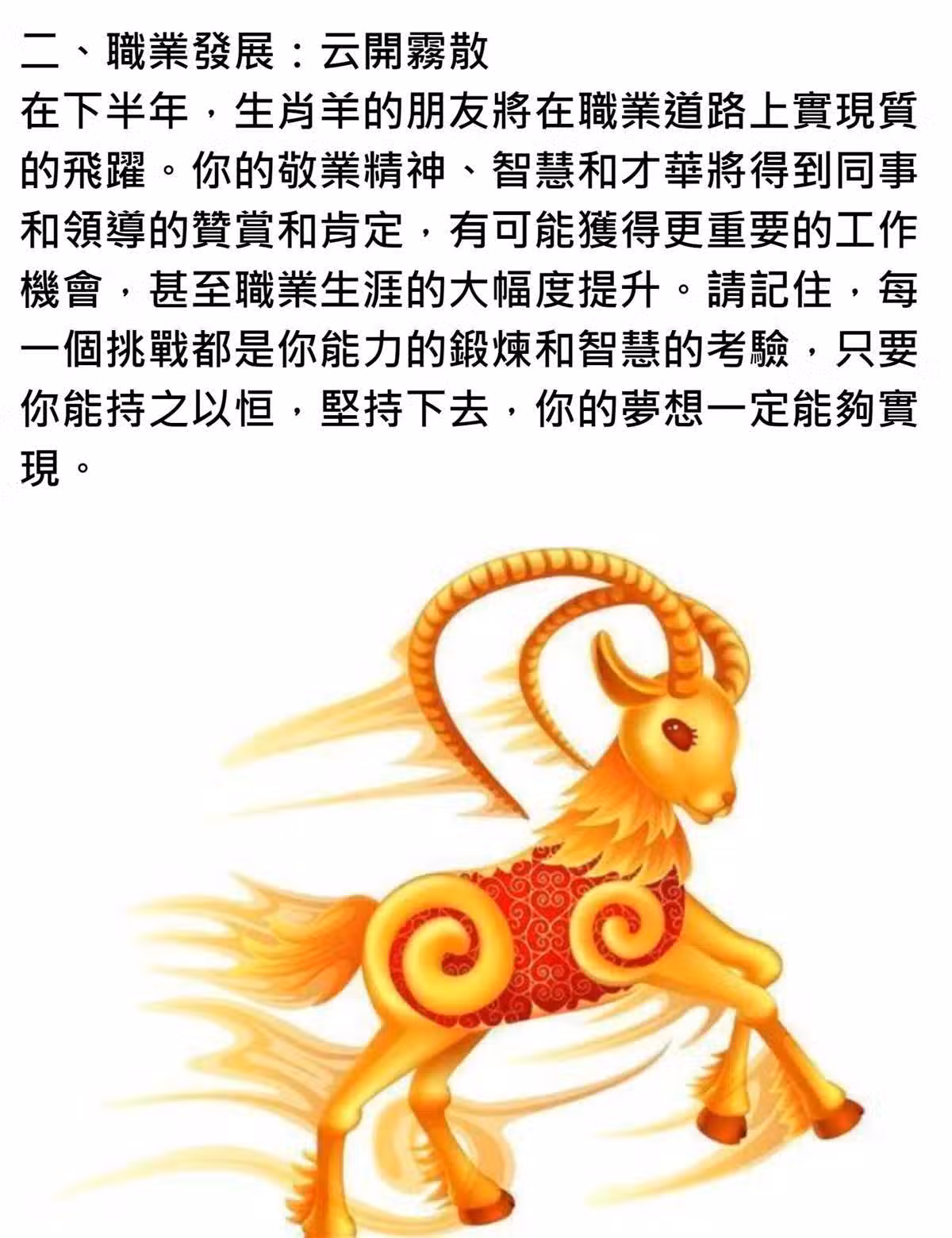 在下半年,生肖羊的朋友將在職業道路上實現質的飛躍。你的敬業精神、智慧和才華將得到同事和領道的替賞和肯定,有可能獲得更重要的工作機會,甚至職業生涯的大幅度提升。請記住,每一個挑戰都是你能力的鍛煉和智慧的考驗,只要你能持之以恆,堅持下去,你的夢想一定能夠實現。