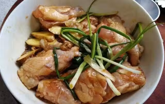 4.腌制時間到了後,把裡面的蔥結、薑片等先撈出來鋪在電飯鍋底。然後再把雞翅根平鋪在上面,把碗里的醬汁全部倒進鍋里。