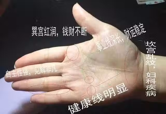 巽宮紅潤並且有方紋出現,一生錢財不斷。明堂位置有方形紋,為人處世很有原則,給人的第一印象極好,做人坦蕩蕩、做事單純,不會在背後使用小手段。這也是一種財運旺盛的表現,其人聚財能力很強,非常善於理財,花錢也很節省,絕不會盲目亂投資,通常都很有錢,而且結婚以後財運會更好。