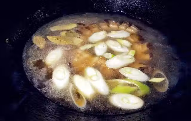 另外開鍋,倒入糖色水加入3片香葉,1塊桂皮,2片甘草,1大勺半黃酒(黃酒需要多些,本菜主要是酒燒,酒香味),1勺鹽(如何判斷先放鹽還是後放鹽?之前大家的想法是做動物性材料的時候要後放鹽,因為鹽會使蛋白質凝固,不容易成熟入味。但其實後方放鹽是需要喝湯的時候,例如燉雞,燉鴨的時候。如果做燒肉,就應該先放鹽,容易入味,雖然會多煮一會,但是做出來的質量和口感好。),2勺糖(這裡為什麼還要加糖?會不會太甜?是不會的,因為之前的白糖已經糊化了,沒有甜味了。所以我們這裡加糖不會太甜,目的是和黃酒搭配回甜口感,還可以提鮮),蔥,姜,1勺白鬍椒粉(姜蔥切片備用)。當然還有我們的主角--五花肉。