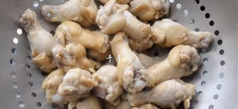 6. 焯水後的雞翅根用溫熱的水沖洗乾淨,控干水分備用。