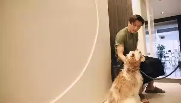 之後霆鋒捉了Mustard去洗白白,Mustard起初有少少反抗想走,霆鋒即時開動暖男mode為牠刷背,連屁股都落手照刷,再用風筒細心將毛吹乾。