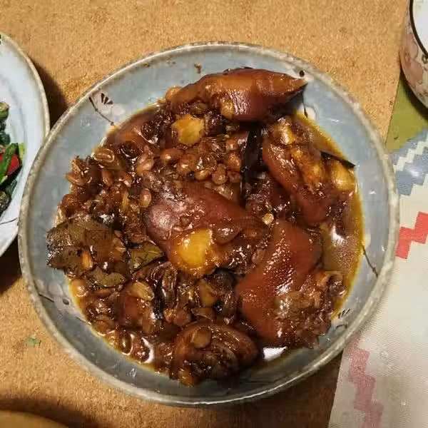 用料:豬蹄、黃豆、蔥、姜、八角、桂皮、干紅辣椒、香葉、料酒、生抽、老抽、冰糖