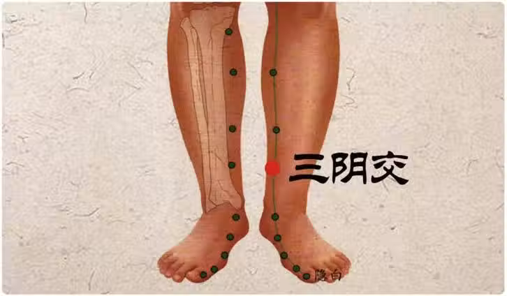 穴位位置:在小腿內側,腳踝骨的最高點往上三寸。按壓有一骨頭為脛骨,此穴位於脛骨後緣靠近骨邊凹陷處。