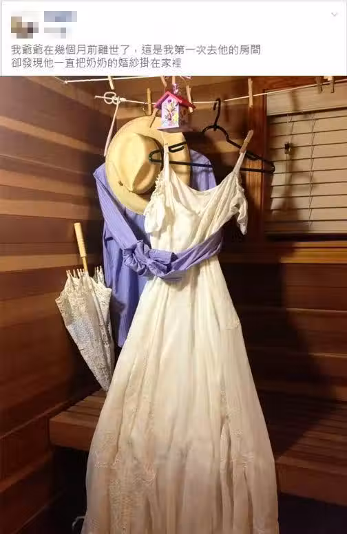 只見照片中,衣架上掛著一件紫藍色襯衫,上頭掛著一頂草帽,襯衫的衣袖互相打結,緊緊環繞著一件雪白禮服,角落還放著一支蕾絲洋傘,乍看就像爺爺依舊健在,環抱著心愛的妻子一樣。「這是我第一次去他的房間,卻發現他一直把奶奶的婚紗掛在家裡。」