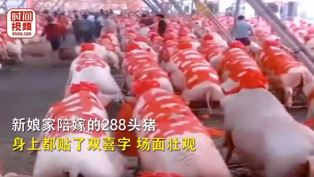 其實一般人準備嫁妝通常是禮金或是金銀財寶,大都是金項鍊、金戒指、金手鐲等等,因此到場參與的親友看到近300頭豬時都很驚訝,表示從來沒有看過那麼壯觀的嫁妝!另外知情人士爆料,男方家的產業其實是肉製品加工廠,因此兩家成親剛好可以串接成上下游統包事業,不只門當戶對,更可以形容為「強強聯合」~