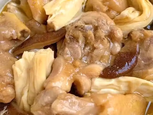 準備食材:雞肉,腐竹,香菇,薑絲,蔥段。