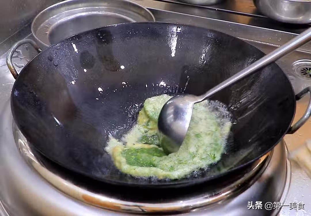 3.雞蛋處於半凝固時,把凝固的雞蛋扒在一邊,再放入蔥花翻炒出蔥香味,一面凝固以後翻過來煎另一面,這樣蔥香才能充分和雞蛋融合,像煎蛋餅那樣來回多翻幾次,把雞蛋液全部定型。