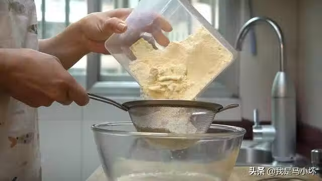 3、把低筋麵粉跟玉米面一起過篩到雞蛋液里,用打蛋器輕輕拌勻。