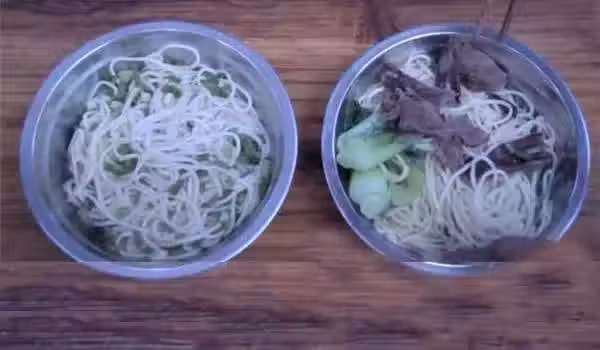 年輕人立刻會意, 原來為了省錢, 他自己要吃蔥油麵, 卻不想被父親發現。 看到小男孩如此懂事的舉動, 年輕人心裡頓覺得有些酸酸的。 不久後, 他就端來一碗蔥油麵放到小男孩面前, 另一碗牛肉麵則放在他父親前方。