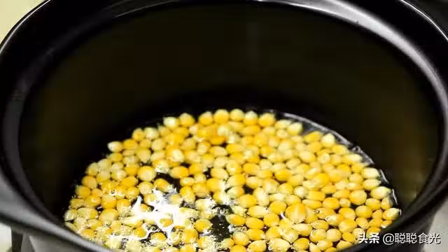 一、同樣的過程,砂鍋中倒入50克玉米油,開中火燒到180℃,倒入80克玉米粒,翻炒一下,此時玉米粒全部浸在玉米油中,當看到有一粒玉米嘣開的時候,立刻蓋上蓋子,裡面開始出現啪啪的響聲,中間晃動幾次鍋身。