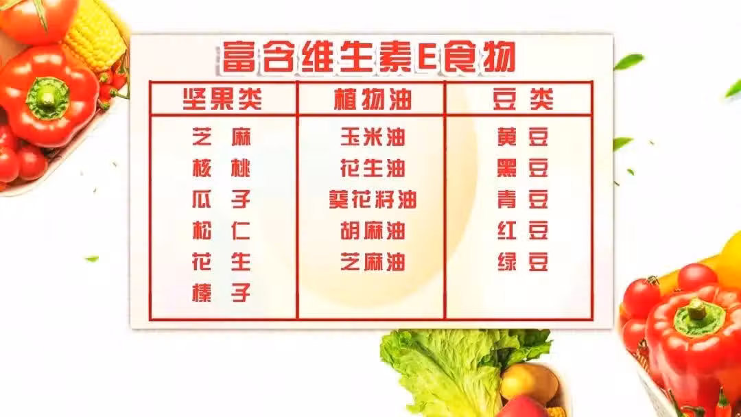 堅果、豆類、植物油等是補充維生素E的好食材,建議大家可以每天吃一小把堅果,注意不要吃太多,以免油脂攝入過量。