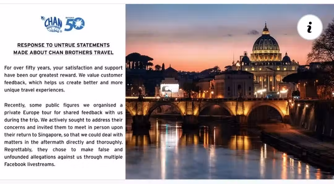 針對事發經過,公司說,今年7月公司為一群網絡直播主,共15人組織了為期6天5夜的克羅埃西亞和奧地利私人行程。但旅程進入最後第二天時,其中一名團員聯繫了公司的工作人員提出反饋,當時公司已盡力糾正,並邀請他們回到新加坡後會面,以徹查事件。