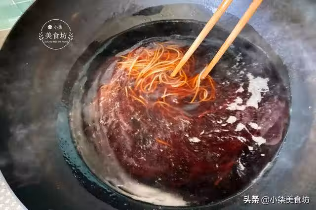 第七步:煮好粉條上醬色後撈出放涼水盆里,再撈出控干水分,這樣煮的粉條是不坨的關鍵。