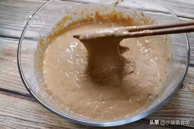 第五步:我們的麵糊就發酵好了,用勺子攪拌排出裡面的氣泡。