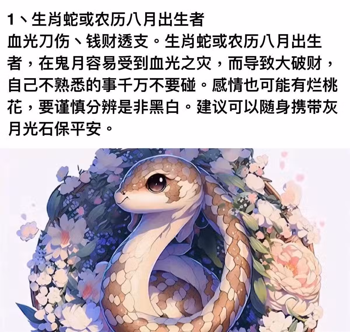 血光刀傷丶錢財透支。生肖蛇或農歷八月出生者,在鬼月容易受到血光之災,而導致大破財,自己不熟悉的事千萬不要碰。感情也可能有爛桃花,要謹慎分辨是非黑白。建議可以隨身攜帶灰月光石保平安。