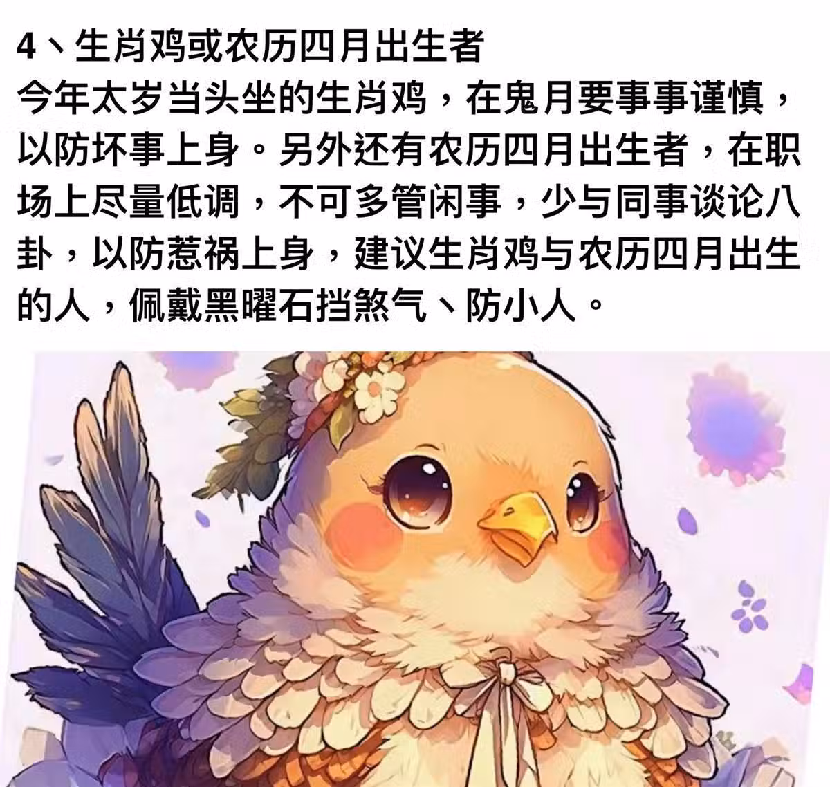 今年太歲當頭坐的生肖雞,在鬼月要事事謹慎,以防壞事上身。另外還有農歷四月出生者,在職場上盡量低調,不可多管閑事,少與同事談論八卦,以防惹禍上身,建議生肖雞與農歷四月出生的人,佩戴黑曜石擋煞氣丶防小人。