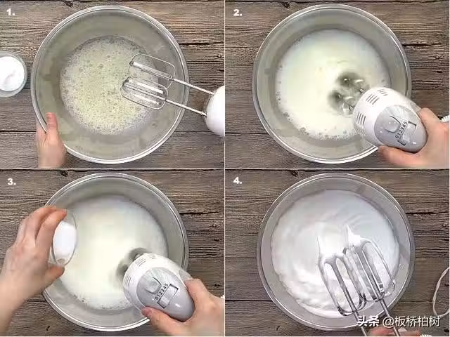 8 分3次把蛋白霜加入麵糊,用人工攪拌器輕輕混合。