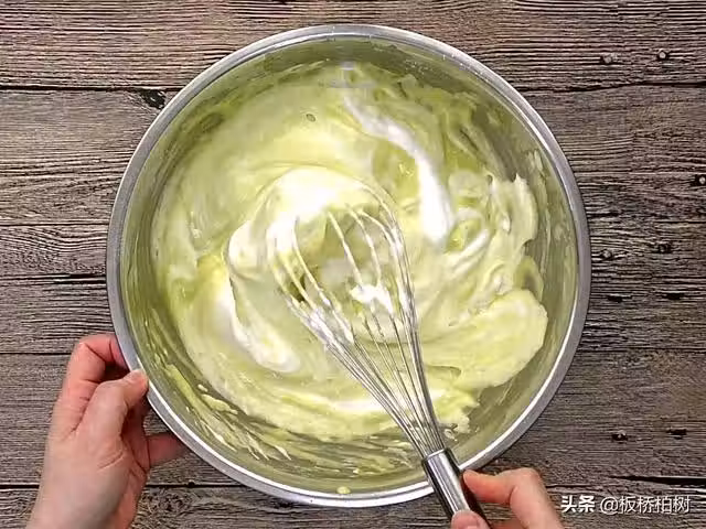 9 再用刮刀輕輕翻拌至完全混合,然後把攪拌碗敲擊桌面數次以震破大氣泡。(溫馨提示: 把蛋白霜拌入麵糊時,動作要輕而快。橡皮刮刀從碗底往上翻轉,翻拌至均勻,不可畫圈攪拌,避免蛋白霜消泡。)